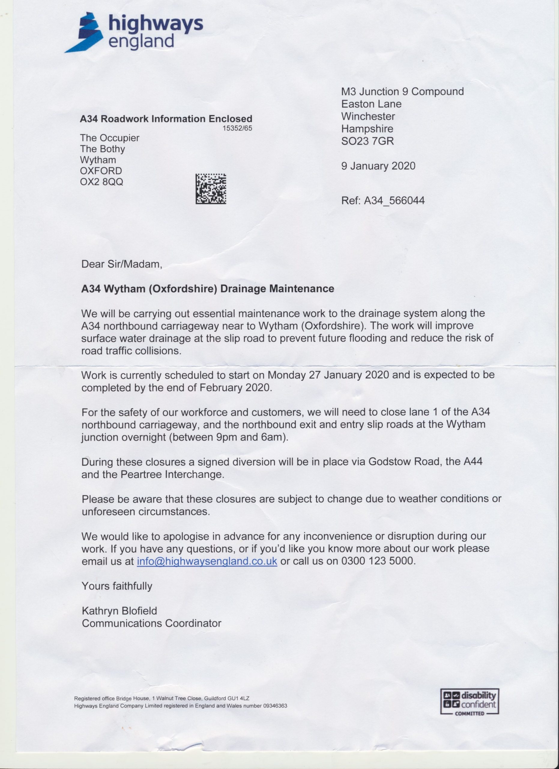 Please see the attached regarding a lengthy lane closure on the A34 Northbound and to the Wytham turn slip road.